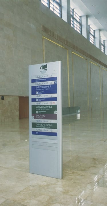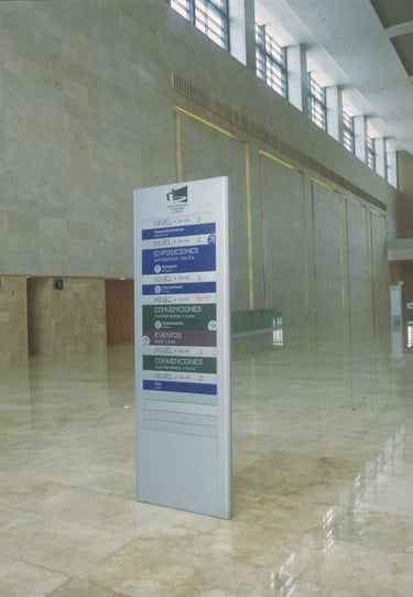 En el proyecto de señalización del Centro BANAMEX, se implementaron tanto sistemas de señalización pasiva como dispositivos electrónicos interactivos, para direccionar y ubicar a los visitantes y usuarios dentro de los diferentes cuerpos arquitectónicos del complejo, dedicado éste al montaje de exposiciones y convenciones de gran escala, utilizándose equipamiento tanto de diseño especial como de línea comercial para un eficiente mantenimiento.