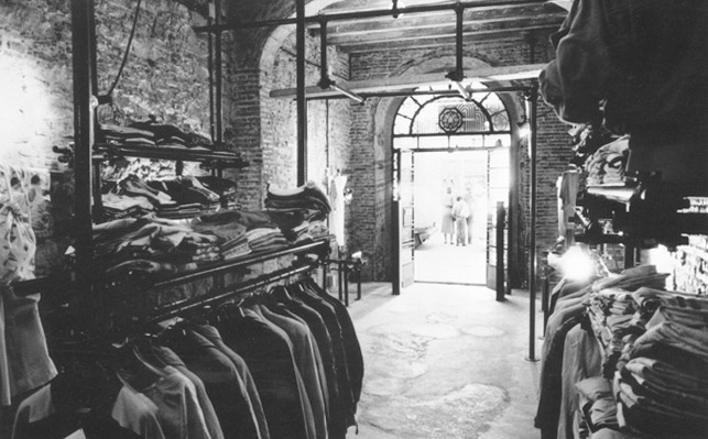 Interior de la boutique SALIDA en Barcelona, España. Proyecto único, construido en una antigua carbonería y que equipamos, como mobiliario para la exhibición de producto, con los andamios re-utilizados durante la obra de adecuación del local.